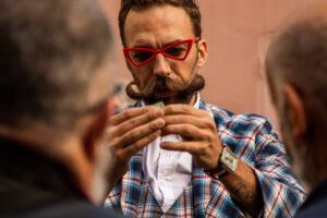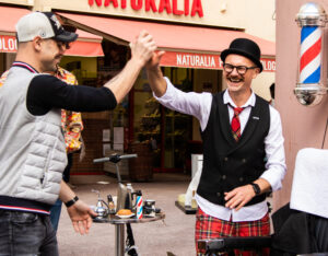Laurent Briard du « Barb’Hair Shop » au Mondrian met gratuitement son fauteuil de barbier à disposition pour vous offrir une glorieuse moustache contre un don libre…